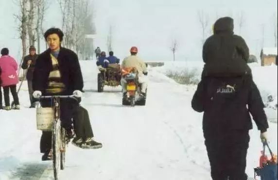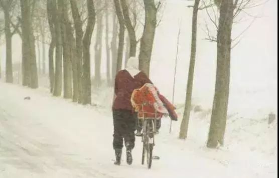 雪再大,路再滑,親戚該走還要走,能騎車了騎車,不能騎車了步行,不知道你注意了沒有,大伯身后還蹲著一個小孩子。這樸實的樂觀讓人感動!