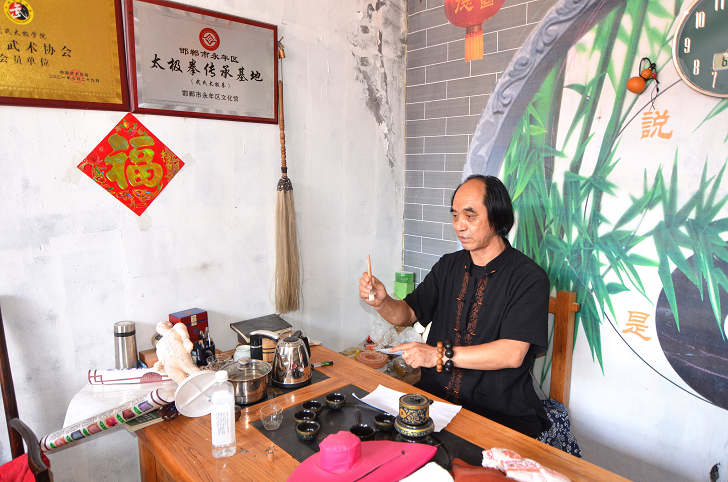 大師熱情客氣地為我們倒上沏好的茶水后問我們是從哪里來的,我們說是從武安磁山過來的,此時,老師急忙問:你們認識磁山二街“鑫山鋼鐵”張總張同發嗎?我們說我們也是磁山二街的,與張同發是街鄰。大師興奮地說:“我在二十年前曾在磁山二街待過一段時間,與張總共同切磋過太極技藝,還在磁山紅山道觀辦過太極館呢”,此時,我們隨行的孔天山老師似乎想起了什么,因為當年孔天山老師曾負責紅山觀的管理工作,還曾為太極武館畫過太極傳人的畫像,說不定還和大師有一面之交呢,只是時間久遠不曾記憶。啊!真是上天的安排,太巧了,此時,大家都很興奮,大師問我們是否有張同發的聯系電話,我馬上在手機的通訊錄中找到張同發的手機號碼,大師迫不及待的撥通了張同發的手機,對方一聽聲音便問道:“你是建國吧”,“啊,我是孫建國,二十多年了你還能聽出我的聲音”,大師激動地同對方聊了前來,講了自己二十年來的基本情況。通過雙方的對話我們方知我們面前的這位氣度不凡的大師就是大名鼎鼎的廣府武家太極第五代嫡傳孫建國老師,他的恩師就是武家太極第四代傳人李錦藩,我們今天太幸運了,剛到廣府就巧遇上太極傳人并且還和我們家鄉磁山有緣。在他們的通話中張同發知道了是我們這幾個人在大師這里后,就謙虛地給大師介紹說:“他們幾個都是我的街鄰,其中孔天山還是我的武術啟蒙老師呢,他們有什么事你多多關照”。此時,大師就向我們簡單介紹了他的基本情況,通過介紹和觀看老師的簡介我們一行都感到十分地驚訝和敬佩。