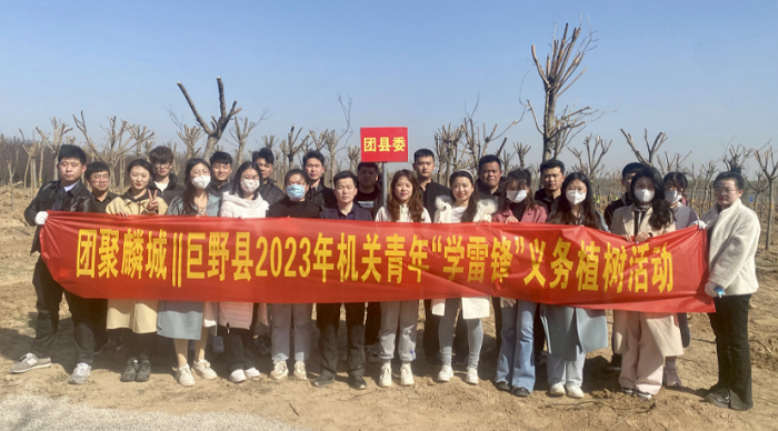 首先,大家來到了此次植樹點—巨野縣龍美生態產業園,各位青年相互配合,合力扶苗、揮鍬填土、踩實壓緊、提桶澆水,經過一番緊張有序的勞動,一棵棵新栽下的樹苗迎風挺立,生機盎然,為龍美生態產業園增添了絲絲春意。