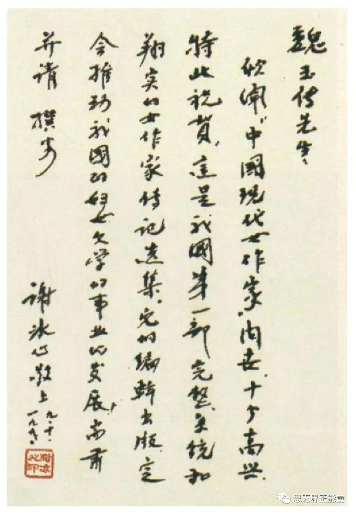 《中國(guó)現(xiàn)當(dāng)代女作家傳》一書問世后,曾作為中國(guó)婦女出版社的一號(hào)重點(diǎn)圖書,先后選送到在新加坡舉辦的國(guó)際圖書展覽會(huì)和在北京舉辦的海峽兩岸首屆婦女讀物交流展參展,倍受關(guān)注。不久,該書被全國(guó)婦聯(lián)和國(guó)家新聞出版署評(píng)為“全國(guó)優(yōu)秀婦女讀物”。“五四文學(xué)運(yùn)動(dòng)的最后一位元老”謝冰心得知該書出版后,十分高興,她老人家不顧九旬高齡,欣然揮毫給筆者寫信表示祝賀: