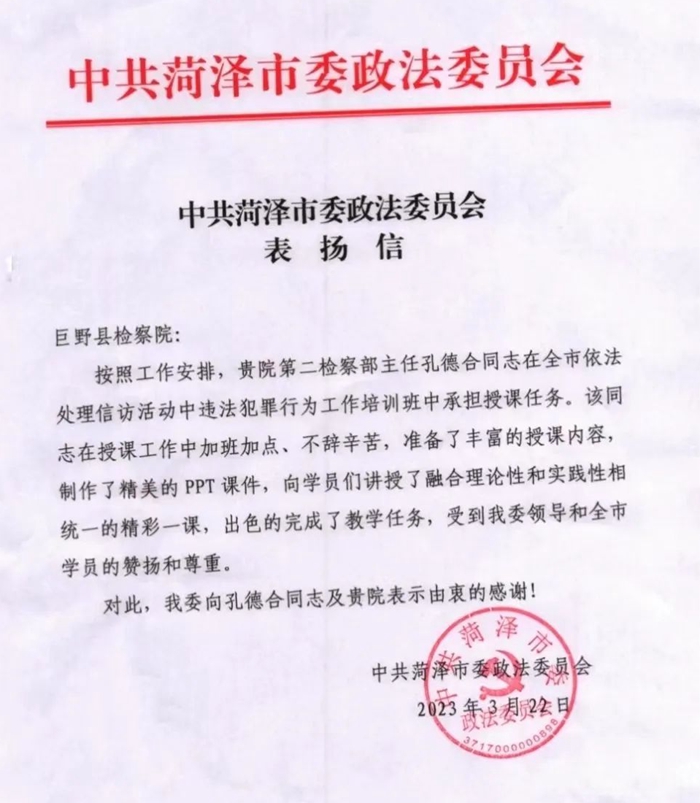 表揚信寫道:“孔德合同志在全市依法處理信訪活動中違法犯罪行為工作培訓班中承擔授課任務,在授課工作中加班加點、不辭辛苦,準備了豐富的授課內容,制作了精美的PPT課件,向學員們講授了融合理論性和實踐性相統一的精彩一課,出色的完成了教學任務,受到我委領導和全市學員的贊揚和尊重。對此,我委向孔德合同志及巨野縣檢察院表示由衷的感謝!”