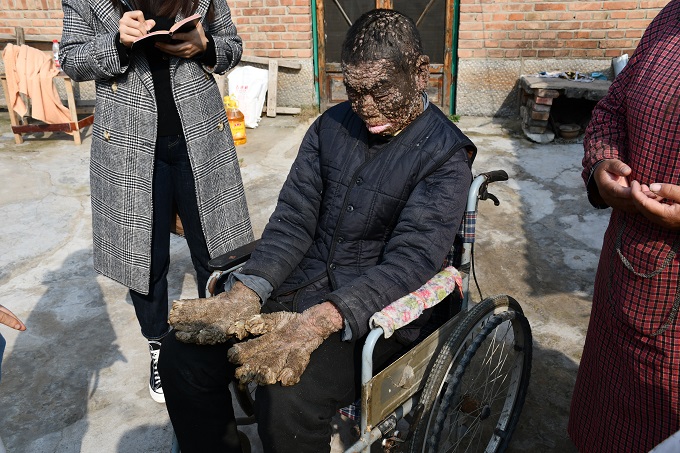 病人名字石雞喚,今年26歲,雙手和雙足長滿了厚厚的甲殼狀的東西,坐在輪椅上不能動彈,26的年紀看上去有6、70歲。病人石雞喚媽媽趙銀順介紹說,小雞喚出生時一切正常,12歲那年手掌背上長出來一個刺猴子,聽一位長者說用香煙頭可以燒掉它,于是好奇的孩子果然用煙頭去燒,結果刺猴沒有治好,反而刺猴從手掌向外一個接著一個迅速擴展,以致后來長滿了全身。