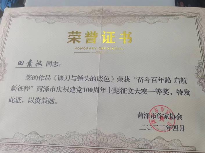 本報訊 近日,山東省作協(xié)會員、菏澤市青年作協(xié)理事、巨野縣作協(xié)副主席田素漢收到喜報,其散文《民以食為天》已榮獲第三屆“最美中國”當代詩歌散文大賽一等獎。這是他繼詩歌《鐮刀與錘頭的底色》2022年4月榮獲菏澤市慶祝建黨100周年主題征文一等獎,詩歌《荷葉撐開了生活的圓滿》