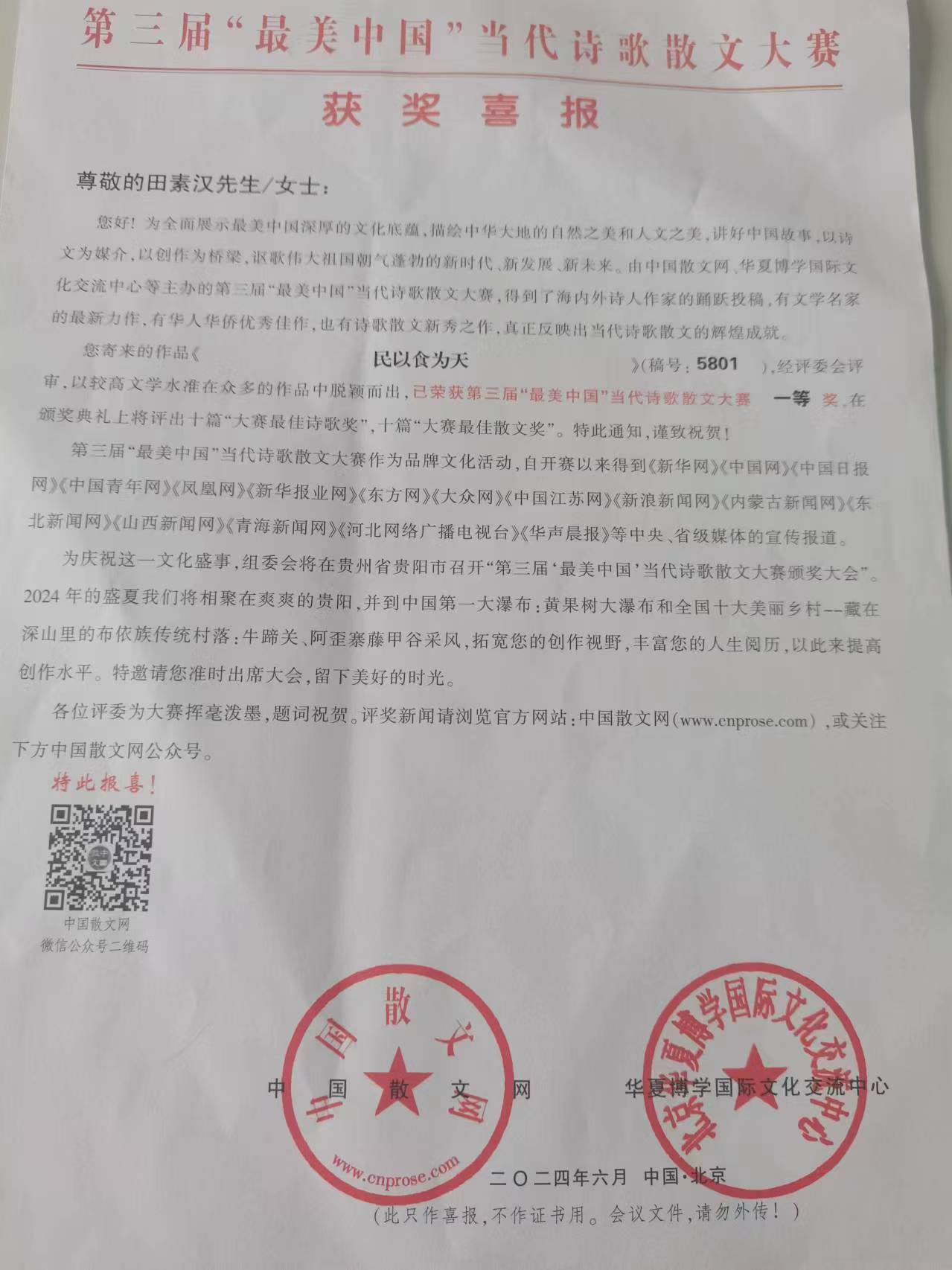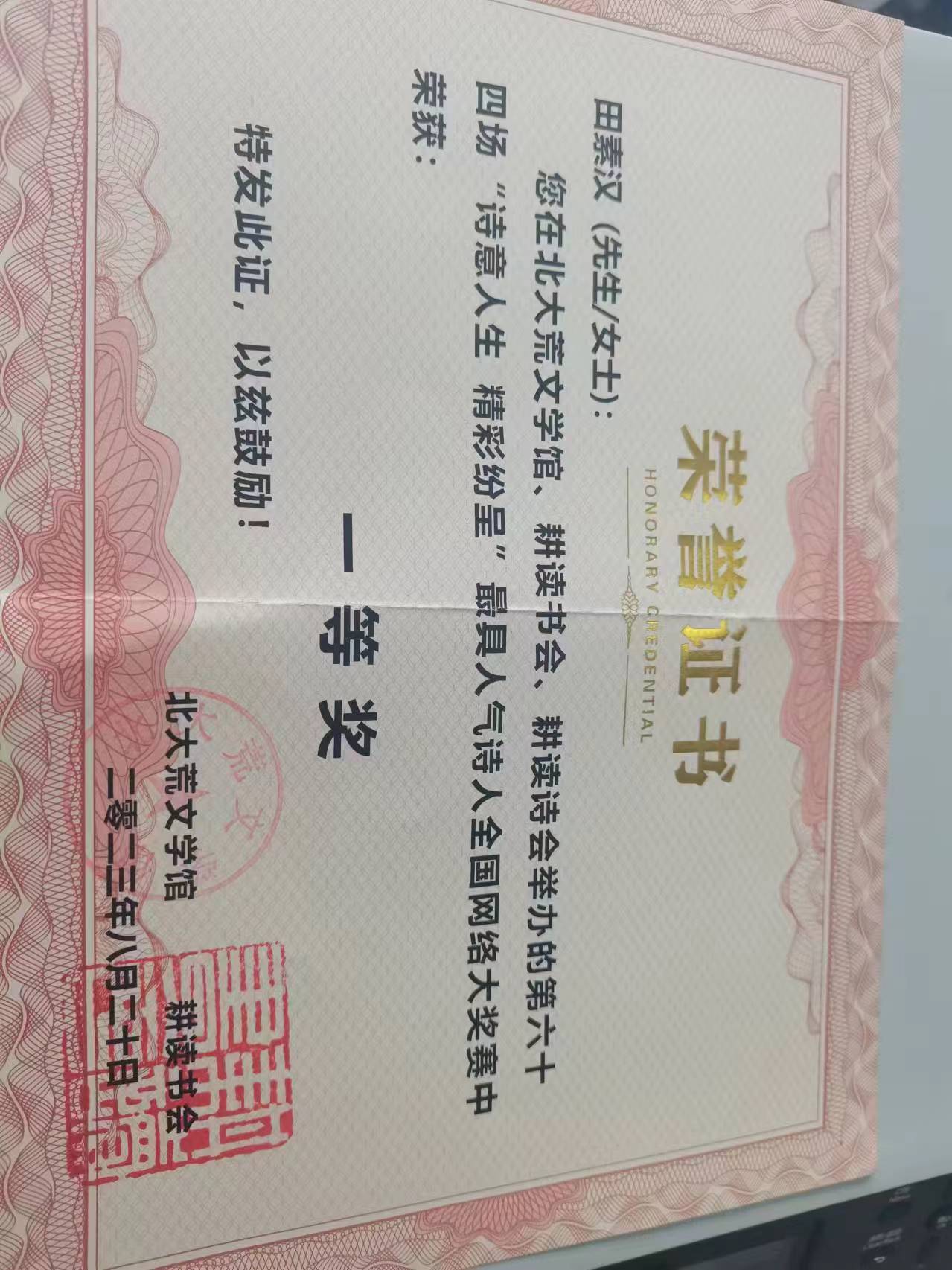 2023年8月榮獲北大荒文學(xué)館第64場“詩意人生 精彩紛呈”最具人氣詩人全國網(wǎng)絡(luò)大獎賽一等獎之后,榮獲的又一個文學(xué)獎項。