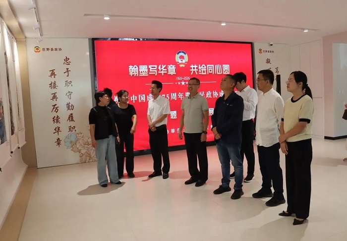 本報訊 9月24日,菏澤市文化和旅游局黨組書記、局長楊東波、曹州書畫院院長徐明軍一行到我縣文化藝術中心參觀“慶祝新中國成立75周年暨人民政協成立75周年書畫展”,巨野縣政協主席魏宏峰陪同活動。