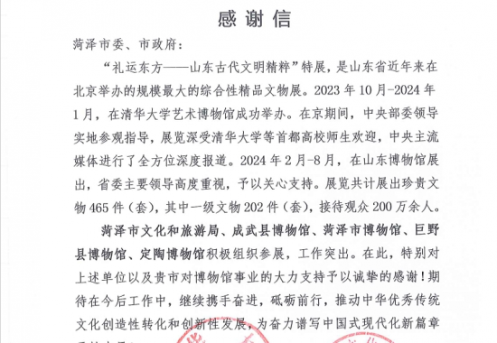 本報訊 近日,清華大學、省文化和旅游廳聯合對菏澤市委、市政府發來感謝信,信中對巨野縣博物館在“禮運東方:山東古代文明精粹”特展中做出的突出貢獻表示了感謝,這是對巨野縣博物館工作的極大支持和肯定。