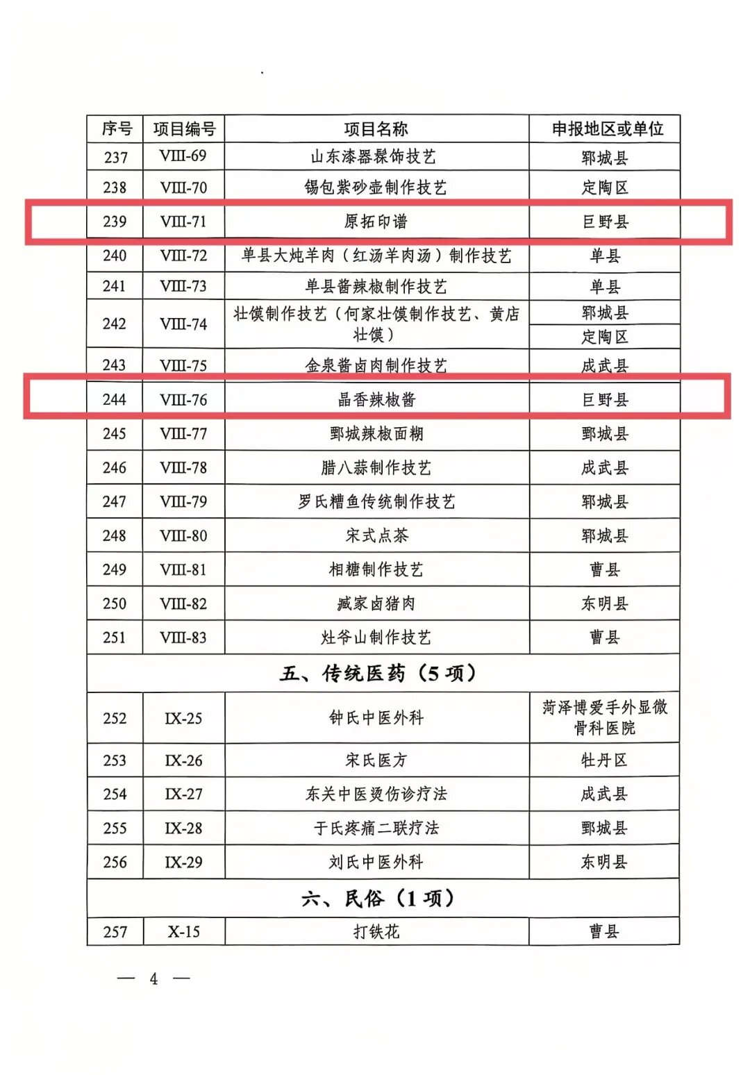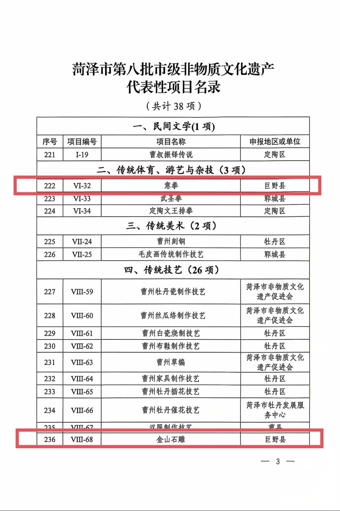 日前,菏澤市人民政府公布了第八批市級非物質文化遺產代表性項目名錄,巨野縣“意拳”“金山石雕”“原拓印譜”“晶香辣椒醬”等8項非遺項目入選。至此,巨野縣共有國家級非遺項目2項,省級非遺項目8項,市級非遺項目23項,縣級非遺項目38項。