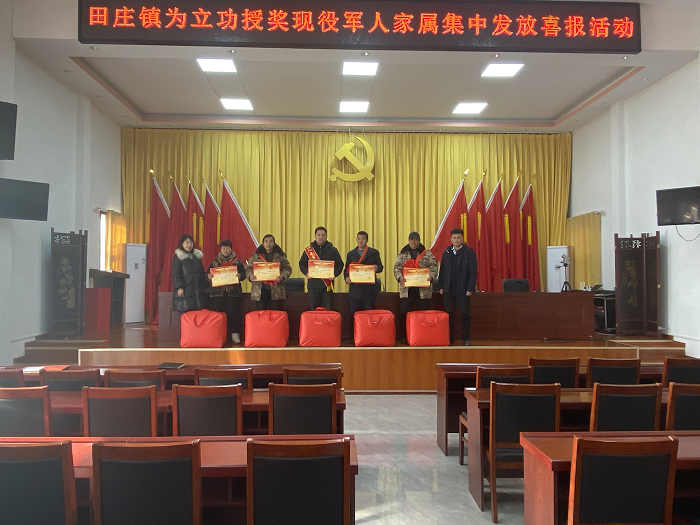 儀式現場田莊鎮武裝部、田莊鎮退役軍人服務站相關同志對5名立功受獎現役軍人家屬頒發立功喜報、慰問品并表示熱烈祝賀,希望廣大現役軍人切實擔負起黨和人民賦予的新時代使命任務,為實現中國夢、強軍夢努力奮斗,為家人爭光、為家鄉添彩、為軍旗增輝。廣大軍屬要繼續做好軍人事業上的堅強后盾,照顧好家庭,穩定好“后方”,積極支持軍人安心服役,繼續為黨和國家多做貢獻、再立新功。