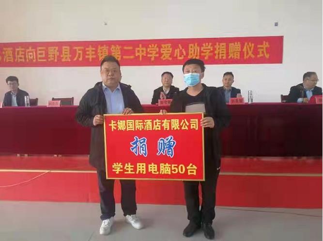 闞光杰、劉來聚都是萬豐鎮人,二人均畢業于萬豐二中,他們經過多年的奮力拼搏,取得了驕人的成績,在天津成立了卡娜國際酒店有限公司,并在山東青島建立了分店,影響力越來越大,經濟效益和社會效益越來越好。他們成功后不忘鄉梓和母校,2016年曾捐贈母校電腦50臺。當他們了解到原來捐贈的那批電腦需要更新時,毅然決定再次捐贈電腦50臺,為學校的發展再做貢獻!