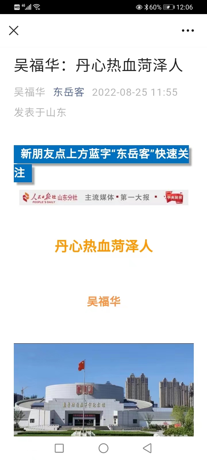 曾分管文化和旅游工作的菏澤市副市長侯婕,看了吳福華的文章《丹心熱血菏澤人》,贊嘆不已,稱道“這實際是菏澤一筆寶貴的財富,傳承紅色基因,要抓緊抓好!”隨后,她及時將此文轉發給了市委相關領導。