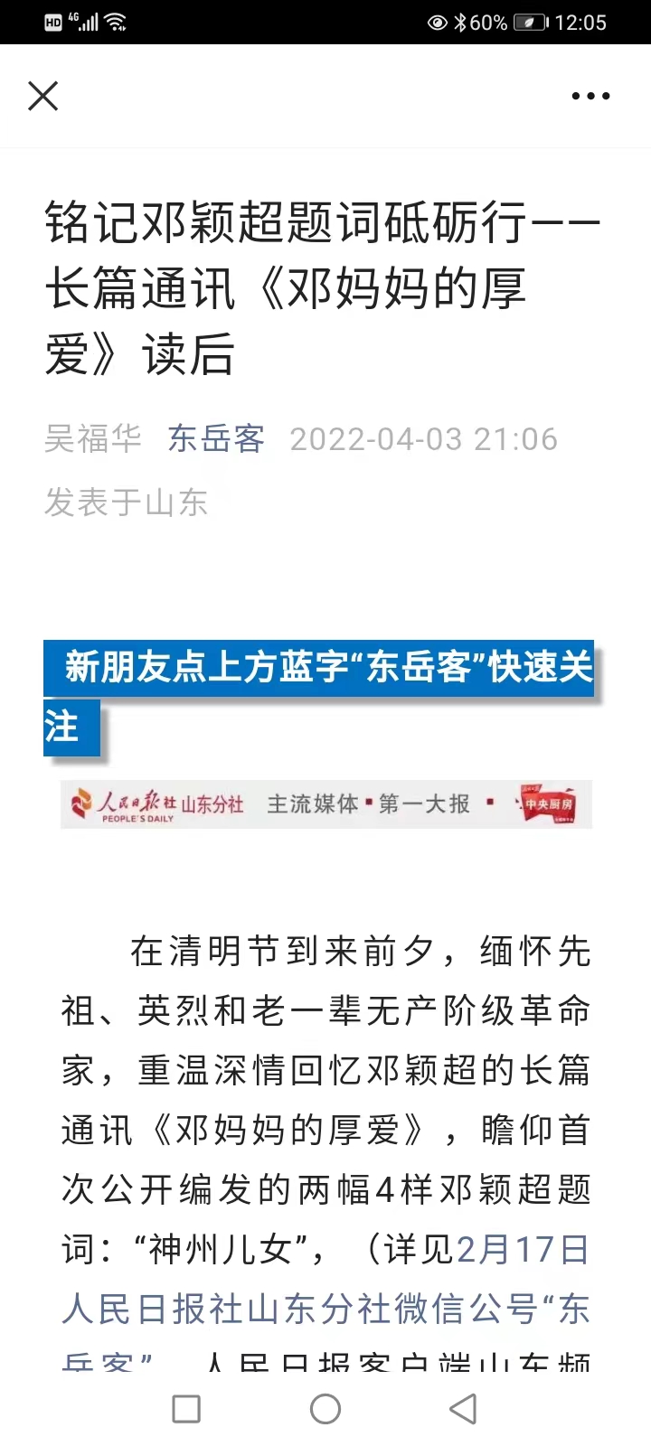 近幾個月來,為了認真落實習總書記關于“傳承紅色基因”的多次重要指示,根據人民日報社山東分社徐錦庚社長的意見:“傳承紅色基因要創新內容和傳播形式”、“讓紅色文化‘活’起來,讓革命文物‘動’起來,讓精神傳承‘新’起來”,唱響菏澤紅色資源的保護和利用,把紅色基因傳承下去,以史為鑒開創全市紅色文化旅游新局面,菏澤文旅集團原黨委書記、董事長吳福華經過認真調查研究,傾情撰寫的新作《銘記鄧穎超題詞砥礪行——長篇通訊“鄧媽媽的厚愛”讀后》、《魯西南散記》,連同他的另一篇文章《丹心熱血菏澤人》(原載《為了神圣的使命——菏澤后來居上耕耘錄》一書,經濟日報出版社出版發行),經筆者略加改動并推薦和介紹,先后被人民日報社山東分社微信公眾號“東岳客”、人民日報客戶端山東頻道及時編發推出,一度在全國引起不同凡響。眾多讀者看后紛紛點贊或留言給予好評,閱讀量連創新高;其中,有的文章還被大眾日報微信公眾號“山東政事”、“搜狐新聞”、“鳳凰網”、“今日頭條”等媒體和不少朋友圈相繼轉發轉播。