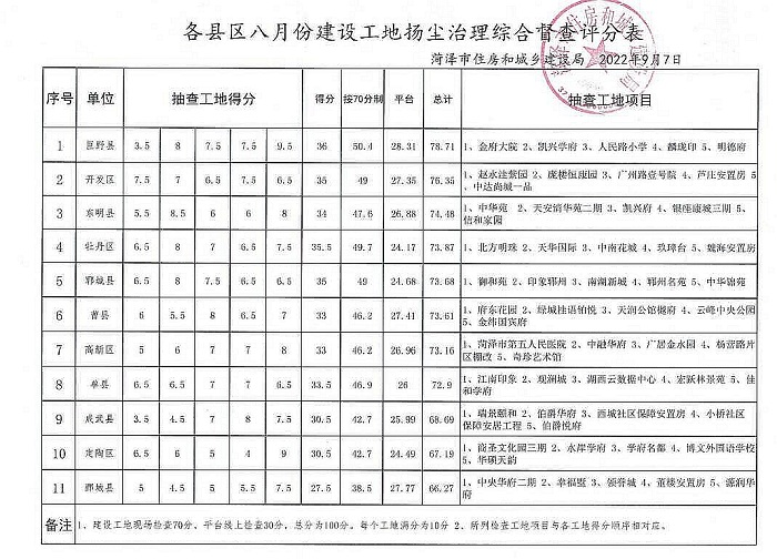 本報訊 9月7日,菏澤市住建局發布各縣區八月份建設工地揚塵治理綜合督查評分表,巨野縣再次位列全市第一。