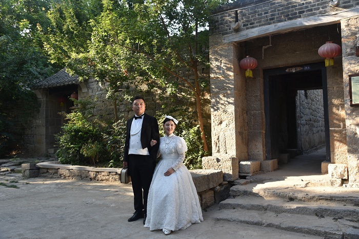 據了解,前王莊被命名為國家級傳統古村落和國家級歷史文化名村以后,吸引了無數的游客前來旅游觀光,600多年的古村落也受到一些婚紗影樓的老板們和現在的年輕人的青睞,古村落成為了婚紗攝影的首選地。圖為年輕人在拍攝婚紗照的情景。 滿常學 攝
