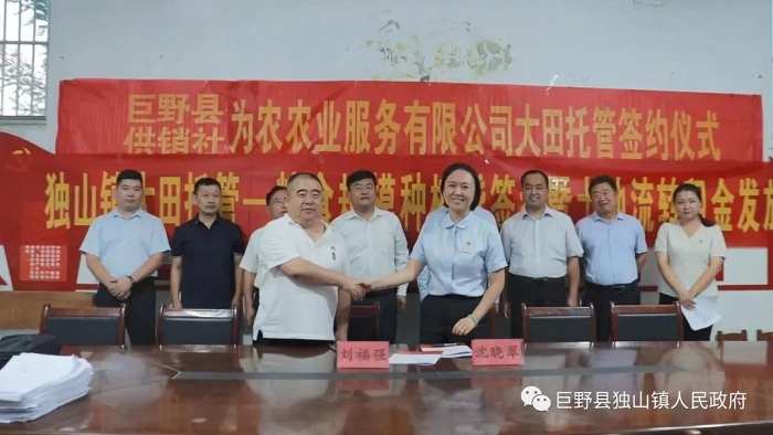 本報訊 9月30日,巨野縣獨山鎮大田托管-糧食規模種植貸暨土地流轉金發放儀式在邢海村黨群服務中心舉行。巨野縣農業農村局、獨山鎮政府、巨野農商行、山東農擔駐巨野辦事處等代表共同見證合作社揭牌、托管公司簽約、銀行授信儀式。儀式后,為300多戶農戶發放土地流轉金58萬元,面對看得見摸得著的實惠,村民們個個喜笑顏開。