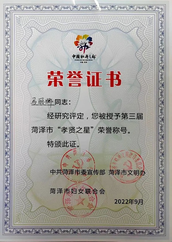 巨野縣公安局宣傳科民警馬麗娜積極踐行家庭美德,對長輩家人自覺履行贍養義務,使他們老有所養老有所樂,同時,作為巨野縣公安局新時代文明實踐志愿服務隊的一員,她積極參加社會敬老、愛老、助老各類公益活動。經逐級遴選、專家評審、網上公示等環節,最終被評選為菏澤市第三屆“孝賢之星”!