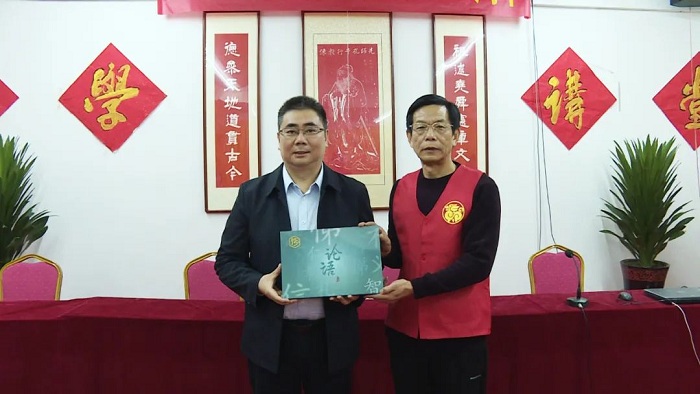 時牧先生向麒麟文化研究院院長彭根成捐贈了《論語傳習》二十四專題。據了解,時牧先生精心研發的《論語》傳習二十四專題系全國首創,獨一無二。此次落戶麒麟文化研究院儒學講堂,是對中國麒麟之鄉莘莘學子的厚愛,目的是讓孩子們由家長、學校的“要我學”,到孩子發自內心的“我要學”。