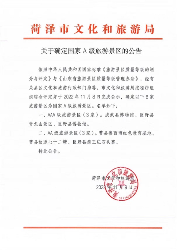本報訊 11月9日,菏澤市文化和旅游局發布關于確定國家A級景區的公告,巨野縣青龍山景區、巨野縣博物館獲批國家3A級景區;巨野縣前王莊石頭寨獲批國家2A級景區。隨著此次國家A級景區的成功創建,巨野縣文化旅游事業又添強勁發展動能。