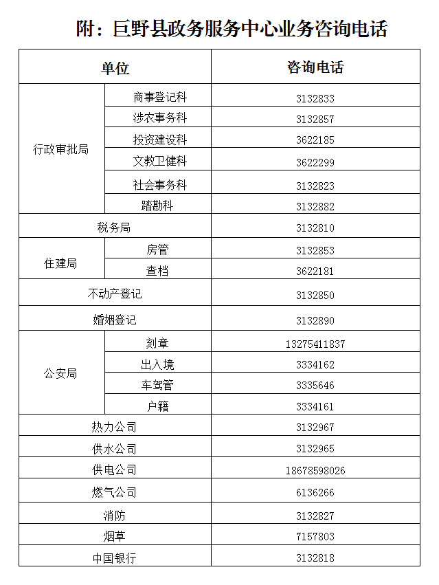 如您有相關辦事需求,可通過山東省政務服務網巨野站,或“愛山東”APP巨野站進行網上辦事、掌上辦事。您也可以在工作時間(上午8:30-12:00,下午14:00-17:30)撥打附件(見文末)中的咨詢電話或政務服務大廳電話0530-3132866、0530-3132897進行咨詢,我們將為您提供詳細的解答和網上申報指導。
