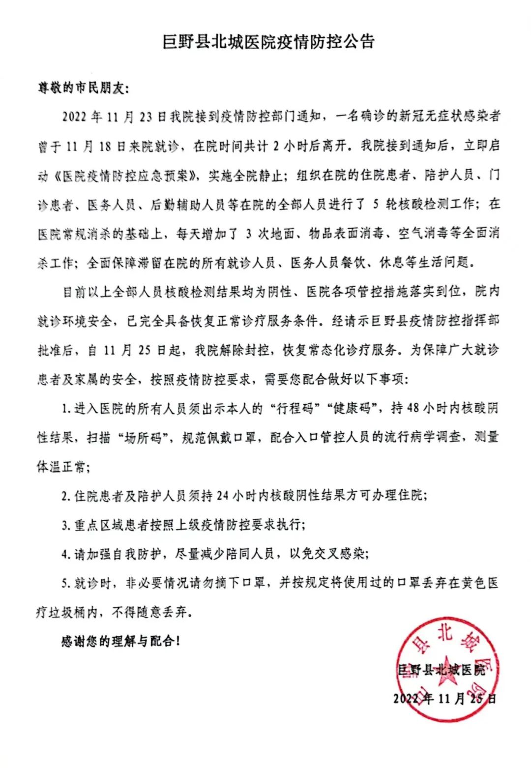 本報訊 11月25日,巨野縣北城醫院發布解除疫情公告,公告稱,自11月25日起,該院解除封控,恢復常態化診療服務。