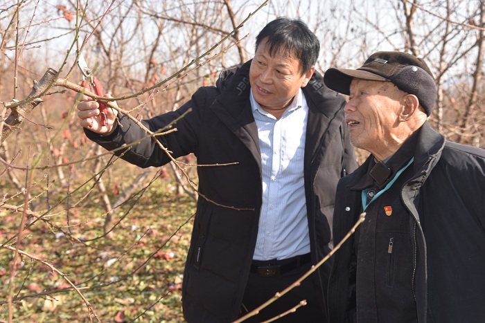 在白虎山雪桃園里,93歲的老黨員、退休的高級農(nóng)技師王者興正在給雪桃園的老板王明性講解雪桃樹冬季管理的要點(diǎn),他一邊講解著管理的要點(diǎn),一邊指導(dǎo)著王明性應(yīng)該剪去那些枝條。