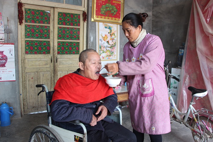 回到家里的公公,生活完全不能自理,床和輪椅成為了公公生活的兩個地方,每天早晨,趙秋霞做好飯后,就去給公公穿衣服,接著就是洗手洗臉、給公公喂飯;晚上的時候,再給公公脫衣服,讓公公睡覺。有了這個病以后,公公不會說話了,沒法和公公進行交流,喂飯的時候,他拿著碗,趙秋霞去給他端菜時,碗就摔在地上了,所以,趙秋霞就一口飯、一口菜的喂。