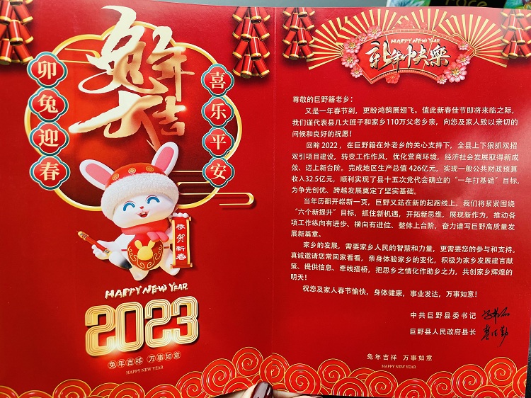 中共巨野縣委書記馮艷麗 巨野縣人民政府縣長楚德勤給巨野籍老鄉的慰問信