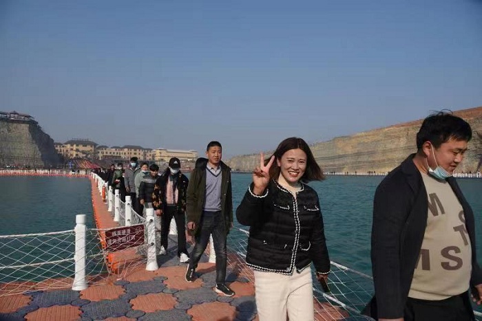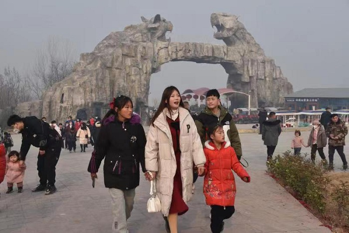 在金山旅游區(qū),那些信男善女帶著高香、箔等物品,帶著自己的各種心愿,或者是求生意發(fā)財(cái),或者期盼兒孫滿堂,或者希望步步高升,所以在中華道觀,避霞祠前,香煙燎繞,形成一道亮麗的風(fēng)景線!在青龍山度假區(qū),若大的廣場上,各種地方小吃,套圈,射擊等游戲吸引了無數(shù)的游客,在青龍山水上樂園,各種游船在湖面游蕩,猶如花朵盛開在水面上,驚險刺激的高空滑索,空中飛船,水上漂流等讓一些年輕人高聲呼叫,新開設(shè)的滑雪場更是人滿為患,兒童,青年人在盡情地享受著滑雪帶來的快樂。白虎山動物園,攀爬王國,冰雪大世界、滑雪場,森林探險等等項(xiàng)目,給大家?guī)砹藷o盡的歡樂和享受,白虎山天池里,一葉葉小船在慢慢的行走中,懸崖峭壁,籃天白云,一種游長江三峽的感覺。古村落石頭寨里,游客在穿越到明未清初時期,感受著最原始的農(nóng)耕文化,品味著石頭大街小巷的魅力,仿佛傾聽著那場劉鄧首長以及解放軍戰(zhàn)士血浴魯西南戰(zhàn)役紅色文化的聲音。