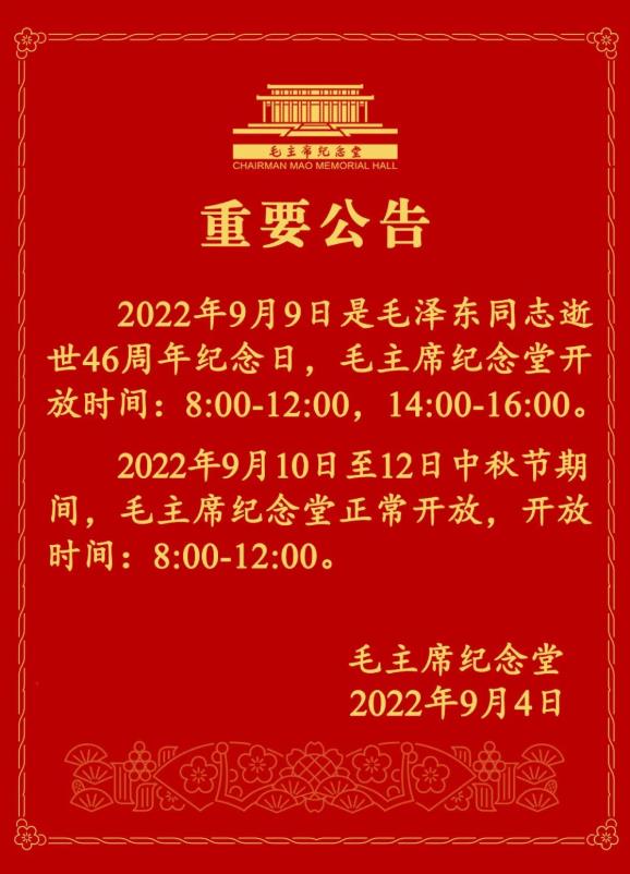 毛主席紀(jì)念堂公告 2022年9月9日,是毛主席逝世46周年紀(jì)念日,開放時間:8:00--12:00 14:00--16:00