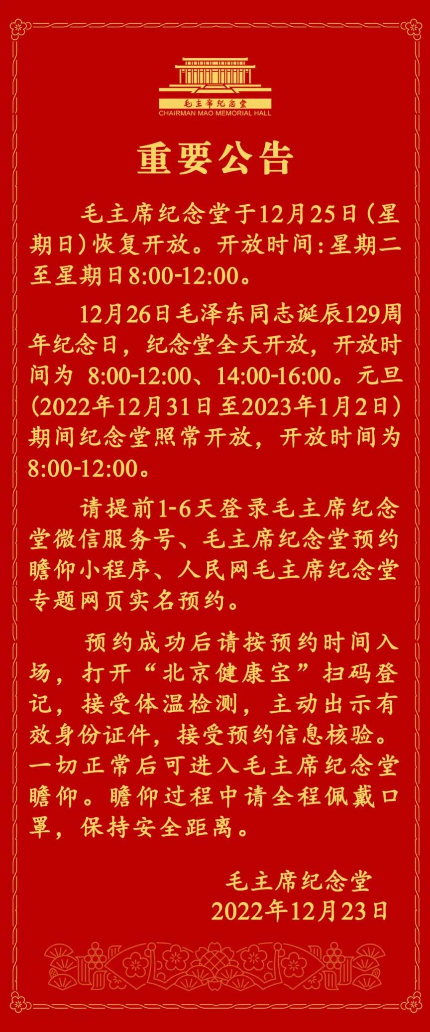 毛主席紀念堂恢復開放:誕辰日全天開放