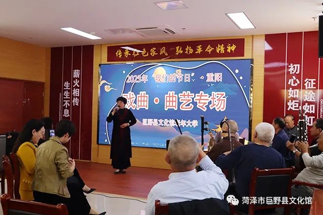 本報(bào)訊 為弘揚(yáng)優(yōu)秀傳統(tǒng)民族文化,豐富老年群體精神文化生活。2023年10月19日下午,在重陽(yáng)節(jié)即將來(lái)臨之際,巨野縣文化館在文化館多功能廳舉辦了“我們的節(jié)日·重陽(yáng)”—戲曲•曲藝專(zhuān)場(chǎng),活動(dòng)采用“群眾演、群眾唱”的方式。參加演出人員多為55周歲以上老年群體。活動(dòng)現(xiàn)場(chǎng),受益觀眾累計(jì)200余人。老年戲曲愛(ài)好者、曲藝愛(ài)好者用扎實(shí)的唱工,傳遞美好的心情和美妙的音樂(lè),藝術(shù)氛圍濃厚。